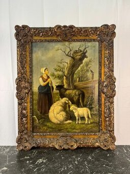 Šířka 68 cm, výška 83 cm. Pastýřka, stádo, starý strom a klid krajiny, který dnes už skoro neexistuje. Olejomalba z přelomu 19. a 20. století, zasazená do původního bohatě řezaného a zlaceného rámu, profesionálně zhotoveného v Bruselu (J. Bessem). Osobní odběr a doprava: Preferujeme osobní vyzvednutí. Nabízíme rozvoz po celé ČR i do zahraničí 12 Kč/km (počítá se celá trasa, tam i zpět). Při zájmu více zákazníků v jednom směru je možné využít sdílenou dopravu. Je možné se domluvit také na zaslání přes TOPTRANS nebo Českou poštu, ale upozorňujeme, že doručení může trvat i 14 dní. Podmínky prodeje: Jedná se o starožitné/použité zboží, které může nést známky opotřebení. Stav odpovídá fotografiím. Osobní prohlídka možná po domluvě. Vrácení není možné, nabízíme však výměnu za jiný kus stejné nebo vyšší hodnoty (s případným doplatkem). Doklad o koupi na vyžádání (vše evidujeme pro DP).