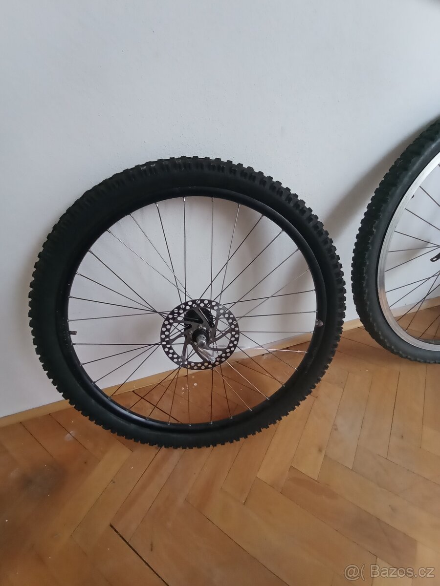 Podám přední a zadní kolo, pneumatiky 26x2,25 - přední nová (Rubena), zadní dobrá (Merida) z kola Leader Fox - viz foto. Přední kolo na diskovou brzdu