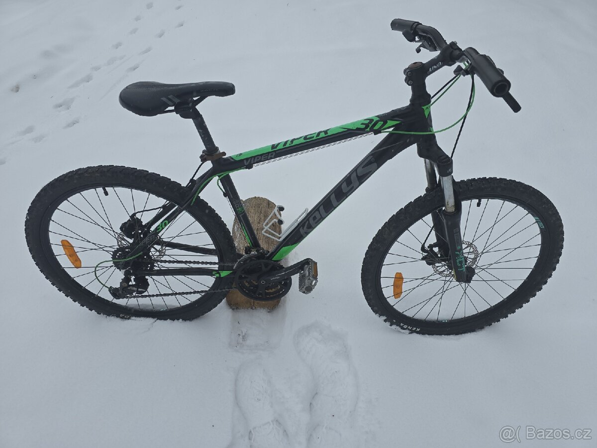 Prodám horské kolo Kellys Viper 30, velikost rámu 17,5", kola 26". Kolo je po kompletním servisu a seřízení v Moravia Sport, autorizovaném prodejci Kellys v Jihlavě. Nově vyměněno: zadní přehazovačka (900 Kč), řetěz (500 Kč), zadní brzdový kotouč (350 Kč), brzdová lanka. Kromě několika drobných šrámů na laku je kolo plně připravené na sezónu a bez jakýchkoliv technických problémů. Před prodejem zdarma vyměním silikonové gripy za nové v barvě dle přání kupujícího (viz fotografie). Při solidnim jednání sleva možná.