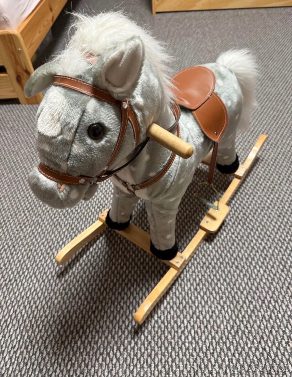 Dětský houpací kůň, po zmáčknutí ucha vydává zvuky jako když běží a druhé ucho jako když řechtá. Stav jako nový!