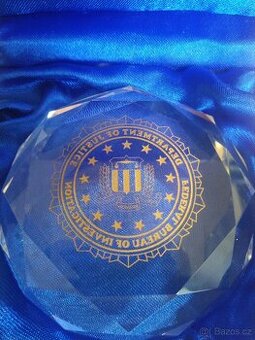 Oficiální dárkový (upomínkový) předmět americké FBI. Těžítko - broušené sklo, v polstrované krabičce. Poslouží sběrateli rarit či jako originální dárek.