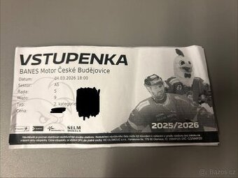 Prodám 2 vstupenky na hokej HC Motor České Budějovice – HC Olomouc Datum: 4. 3. 2026 Čas: 18:00 Sektor A5, řada 5, místa vedle sebe 8 a 9 2. kategorie Cena: 200 Kč / kus (400 Kč celkem) Osobní předání možné po domluvě.