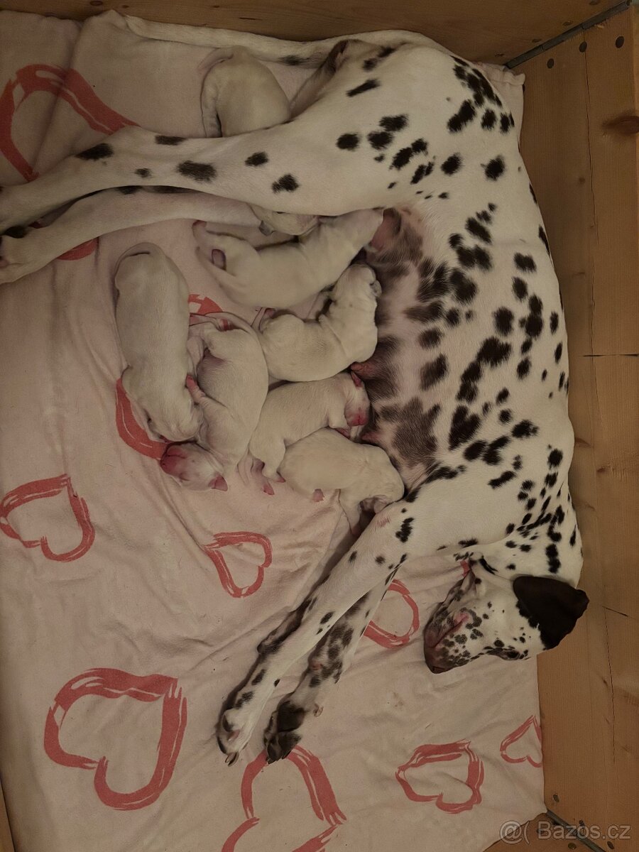 Cena: Dohodou. Nabízím k rezervaci štěňátka dalmatina, narozená 7.2.2026. K odběru začátkem dubna. K dispozici 3 holky a 4 kluci. Do nových domovů půjdou očkovaní, čipovaní a odčervení.