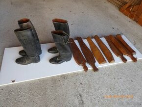 2 páry starých dámských celokožených jezdeckých bot. Dlouho nepoužívané.Obnošené, ale ještě stále použitelné. Délka podrážky 24,5cm, výška 42cm. Včetně dřevěných napínáku/vysoušáků. Cena za vše 500,-Kč. Vzhledem k váze a objemu, preferuji osobní odběr.