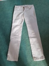 Nabízím dámské bílé kalhoty, velikost asi 38. Drobné flíčky - viz.foto.