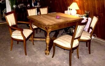 Starý dřevěný rozkládací stůl cca pro 10 osob + 4 židle + 1 židle s područkami. Deska stolu mírně poškozená / potřebuje asi přebrousit/ . Židle jsou dokupované v naprostém pořádku. Osobní převzetí ve Špindlerově Mlýně. Při vážném zájmu, lze jednat o slevě.
