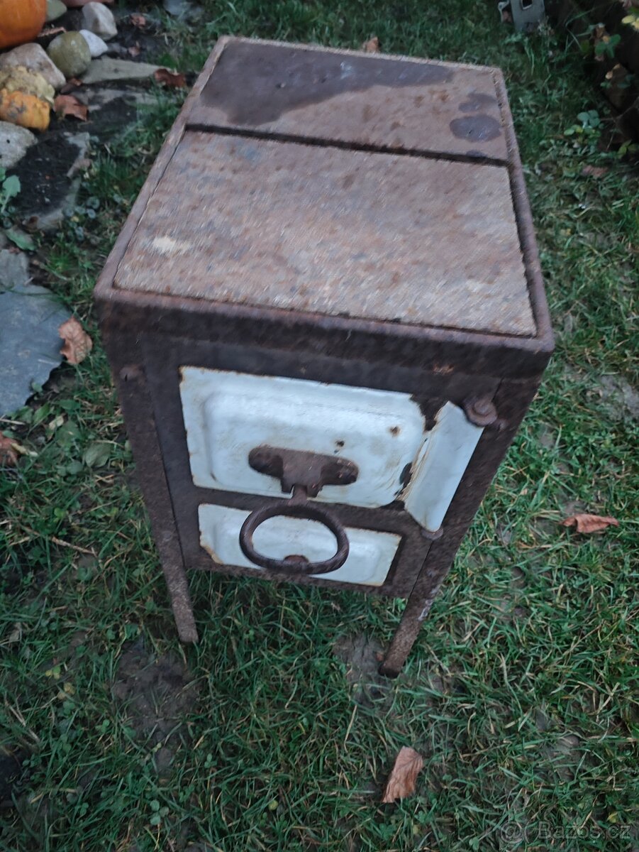 Cena: Dohodou. Prodám stará kovová kamna, vhodná k renovaci nebo jako stylová dekorace na chalupu, zahradu či do interiéru v retro/industrial stylu. Konstrukce je celokovová, s původními dvířky a madly. Stav odpovídá stáří – povrchová koroze, patina. Šamot uvnitř kamínek poškozený.