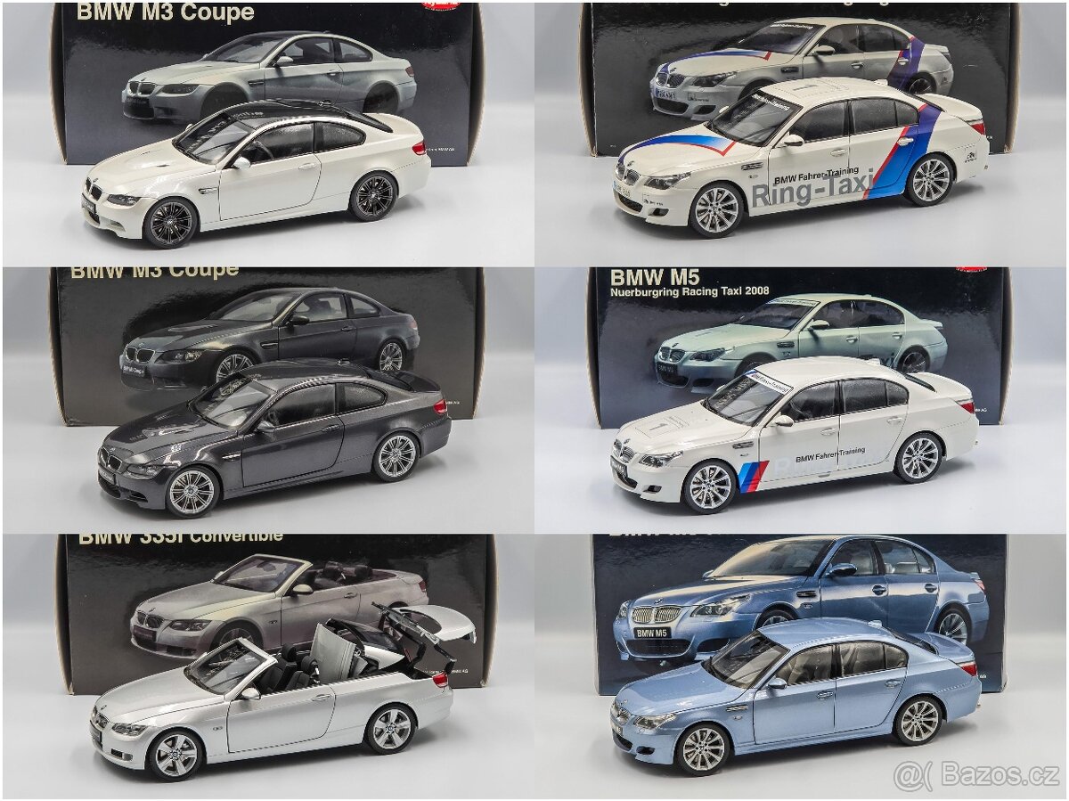 1/18 Kyosho Všechny modely včetně originální krabice v super stavu. BMW E92 M3 - 6500,- KUS BMW E60 M5 Modrá - 6500 KUS BMW E60 Nurburgring - 6000,- KUS BMW E93 Cabrio - 5000,- Více fotek na vyžádání
