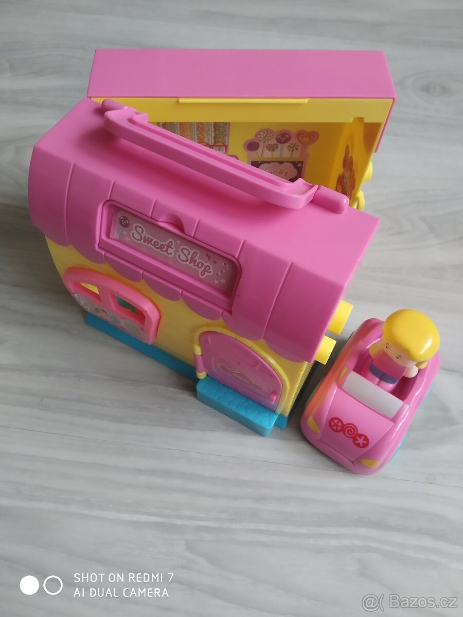 Dětský domeček Sweet Shop Carousel s madlem, má otevírací dveře, dá se spojit s dalšími domečky ze stejné série, součástí je autíčko a panenka, domeček hraje hudbu po zmáčknutí tlačítka. Rozměry délka 19, šířka 14, výška 21 cm.