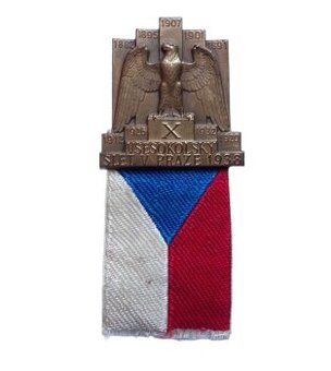 Starý odznak z X. všesokolského sletu 1938, ražený tombak, rozměr 37 x 35 mm, zapínací spona, poštovné od 75,-Kč.