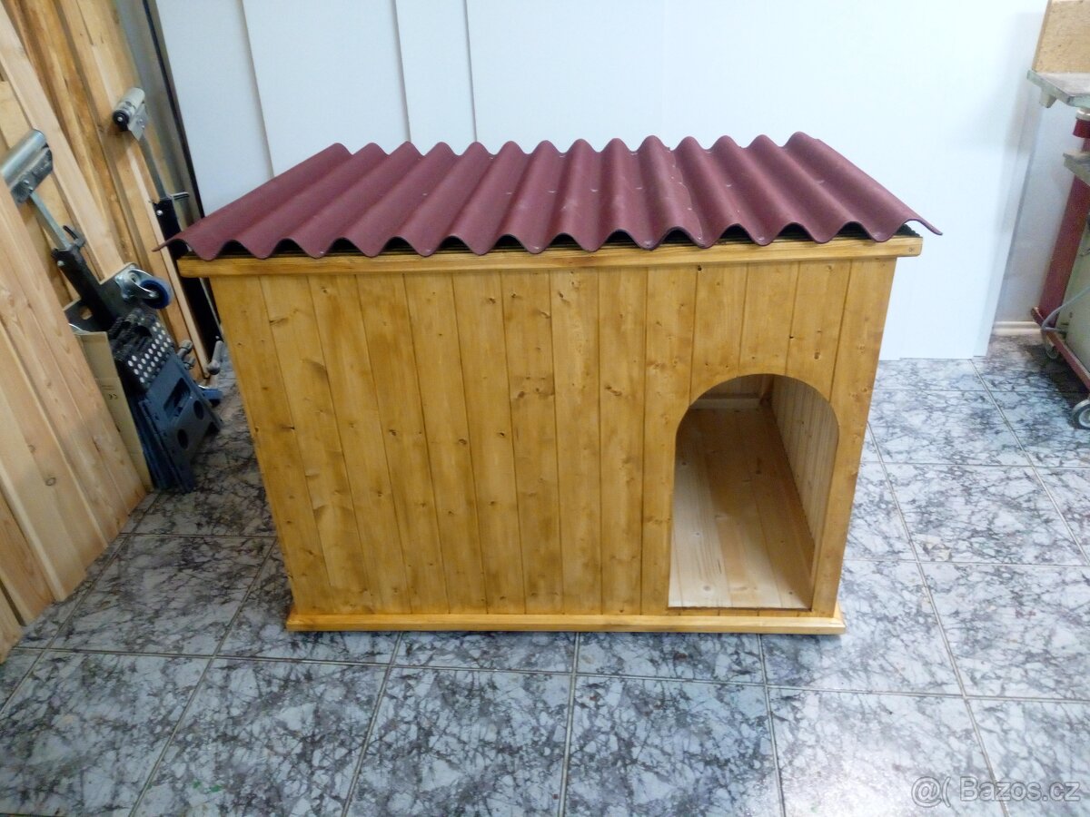 Prodám novou psí boudu. Ložnice, předsíňka,odjímatelná střecha. Vnější rozměry 124×90×90cm, ložnice 73x77cm, předsíňka 32x85cm. Materiál: smrkové palubky 12,5 mm, zateplení 3cm polystyren, celková tloušťka stěny 5,5cm. Zateplená ložnice, strop i dno. PVC průchodová/průvanová clona. Zinkovaný spojovací materiál. Střešní krytina: Onduline červená. Povrchová úprava z vnějšku Xyladecor - Jilm polní Ze spodní strany namontovány kluzáky z 15 mm vodovzdorné překližky. Váha cca 80-90kg. Po dohodě možnost dovozu. Platí do smazání.