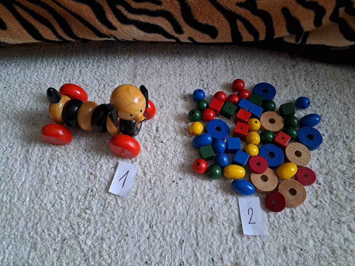 Cena: V textu. č.1. starožitný skládací dřevěný pejsek, 15 x 11 cm. Cena 300,- Kč. č.2. dřevěné korálky k navlékání , 49 kusů. Cena 200,- Kč.