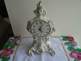 Nepoškozené, zlacené, značené, celoporcelánové, krbové hodiny - porcelánové aplikace růžičky, římské číslice.