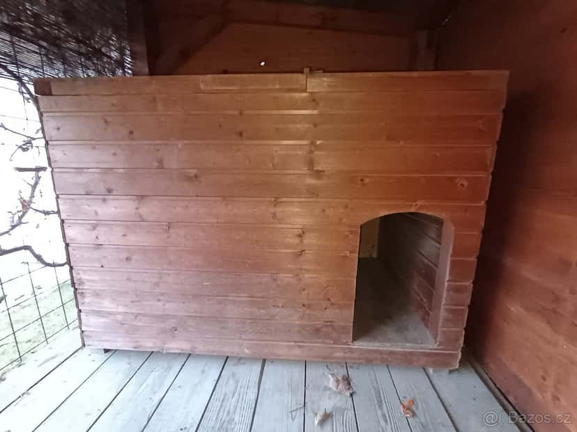 Prodám zateplenou psí boudu. Kostra smrkové dřevo, obklad smrkové palubky, zatepleno polystyrenem. Vnější rozměr š. 143cm, h.92cm, v.102cm. vnitřní rozměr - předsíň š.30cm, h.78cm, v.85cm, ložnice š.88cm, h.78cm, v.81cm. Vchod š.30cm, výška 50cm - dá se zvětšit