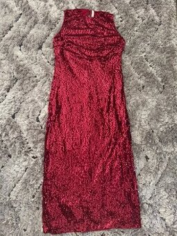 Nabízím na prodej krásné dlouhé společenské šaty s širokými ramínky a dekoltem do tvaru oblouku. Šaty mají podšívku a knoflík za krkem a jsou zdobené celoplošně flitry.Po straně rozparek. Nové, nenošené viz obrázky. Barva- vínově červená ROZMĚRY v klidu:celková délka: cca 140cm, šířka přes prsa: 90cm, v pase: 84cm, boky 102cm Odpovídají velikosti L. Materiál pruží a krásně tvaruje postavu. Rozhodně nezklamou