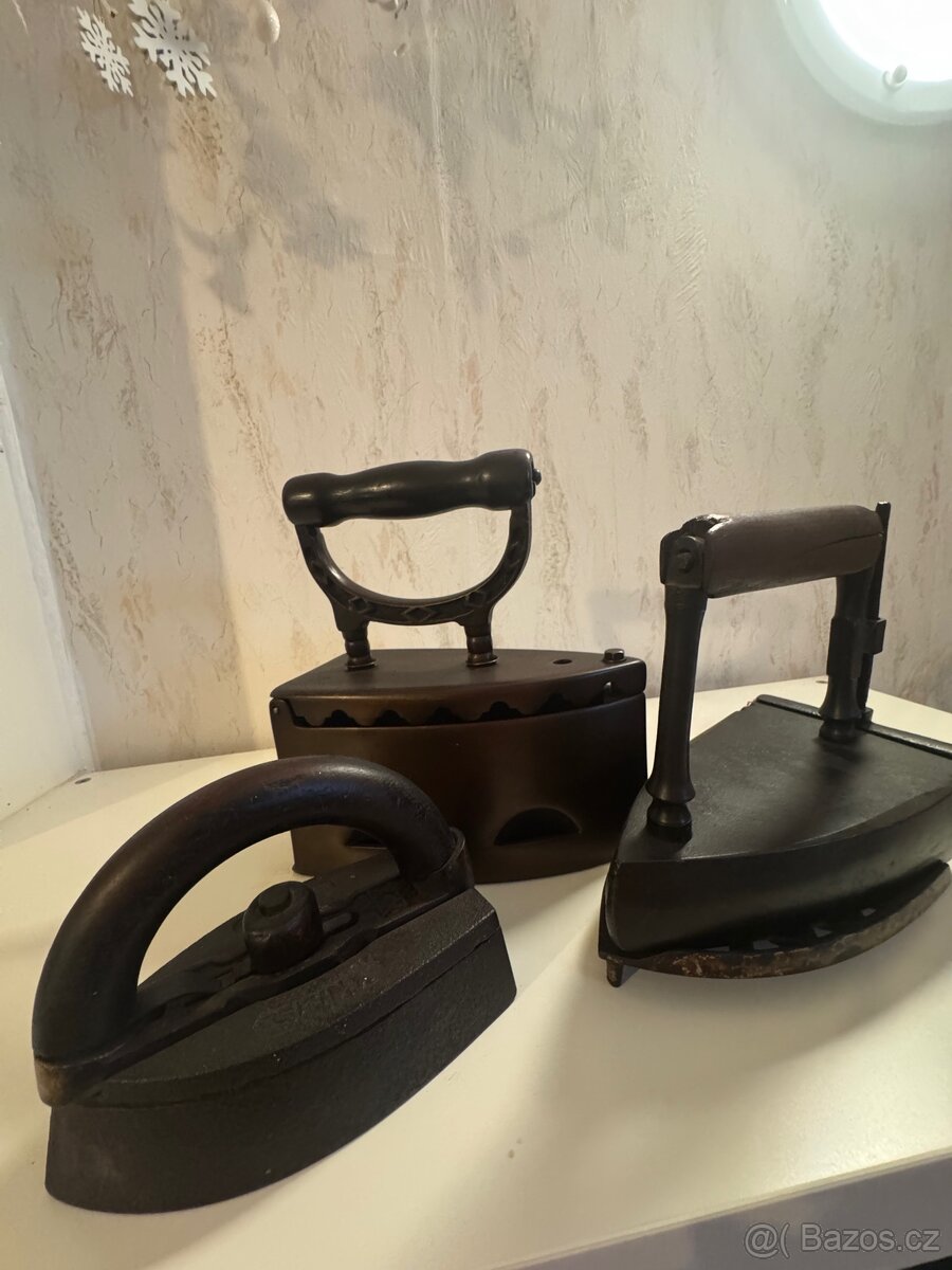 Cena: Nabídněte. Prodám 3 ks starožitných žehliček. Jen dohromady. Cena dohodou.