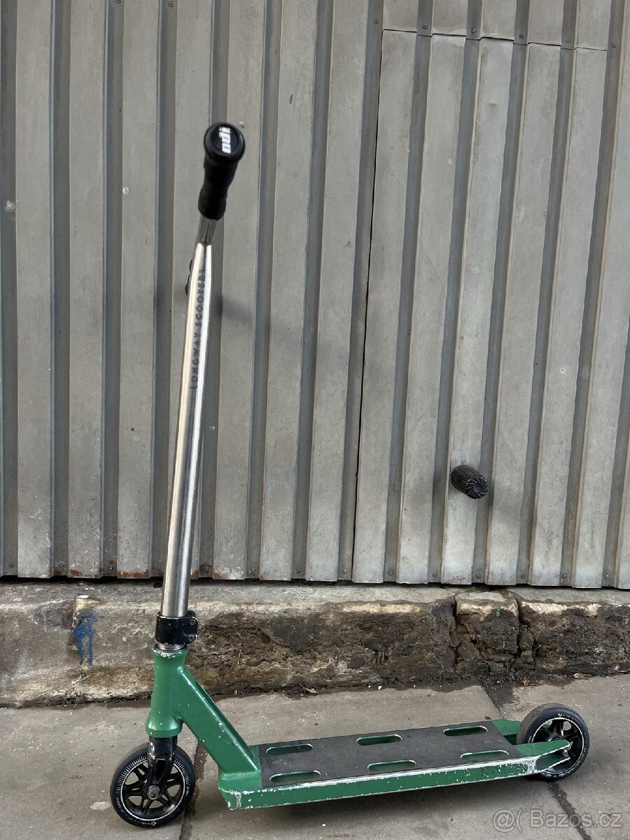 Dobrý den prodávám tuhle koloběžku. Je trochu poškrábaná a pravý grip je děravý. Můžu dovézt po okolí. Prosím jen SMS. Parametry řidítka - Longway Kronos - výška 550mm šířka 610mm Deska - Longway kaiza - délka 480mm šířka 114mm Kolečka - Street surfing 110mm + jedno na víc Gripy - Odi longneck st soft 160mm Objímka - Z kaiza kompletu Grip tape - Jessup Vidlice - Driftwerk nevím přesně jaká