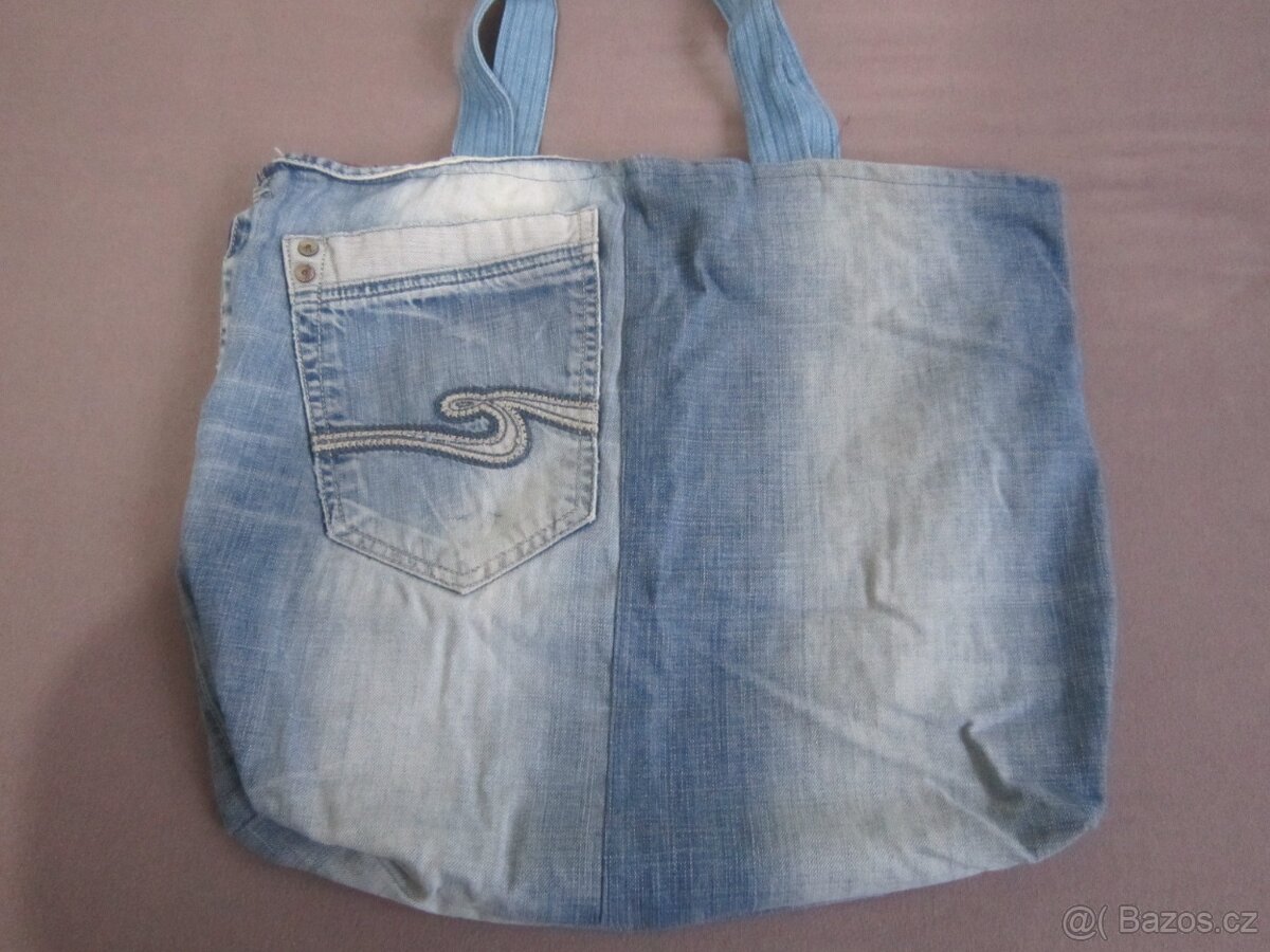 Prodám dámskou, riflovou tašku. Ruční práce, rozměr 43 x 36cm, délka ucha 68cm. Uvnitř 2malé kapsy. Cena 60kč + poštovné