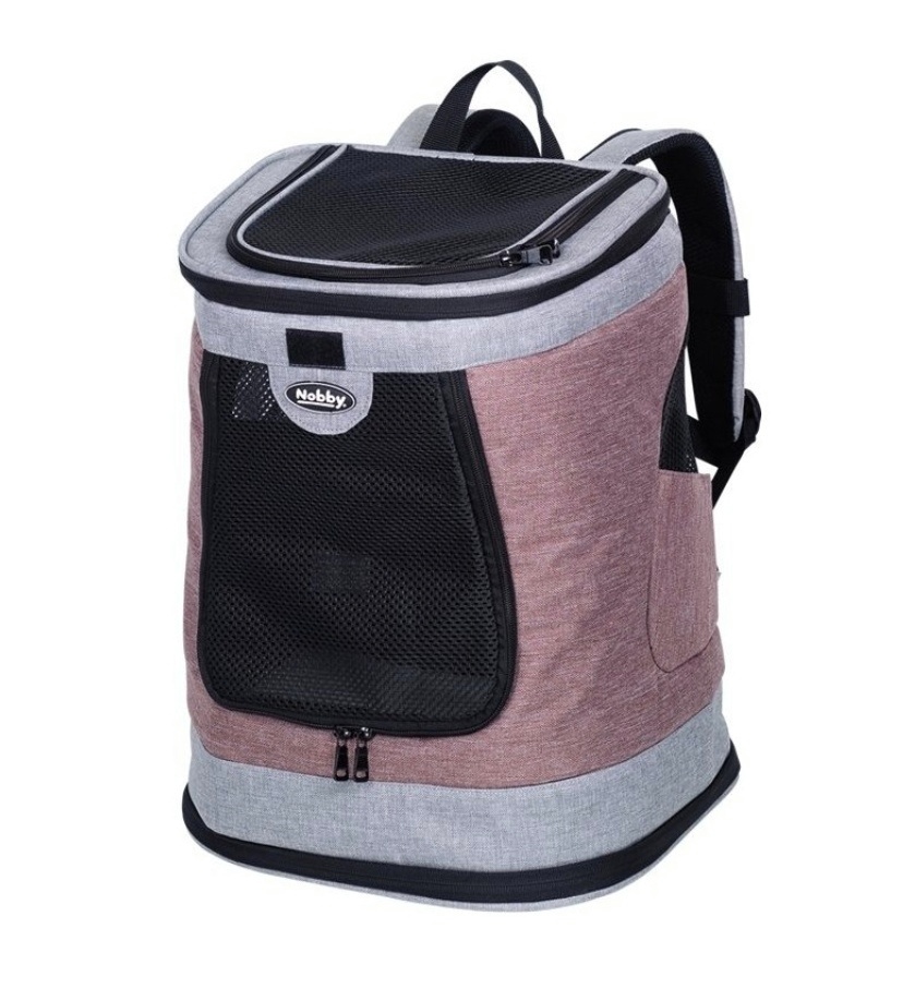 Batoh na kočky a malé psy o maximální hmotnosti do 10 kg. Je vyroben z odolného, omyvatelného mikrovlákna. Ideální pro trekking a větší výlety, má velmi stabilní dno a pohodlná polstrovaná záda. Integrovaná karabina uvnitř batohu zabraňuje zvířeti vyskočení ven. Síťové části zaručují cirkulaci vzduchu uvnitř i při zavření batohu. Batoh má také dvě malé kapsičky na pamlsky nebo hračky.Nepoužitý.V barvě hnědo-šedá.