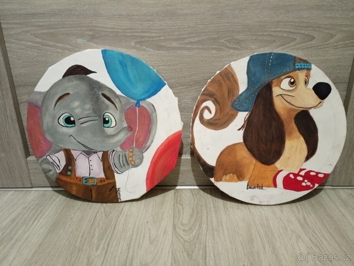 Dárek pro menší děti, udělejte radost krásnými ručně malovanými obrázky zvířátek. Vlastní tvorba, akrylové barvy na plátně. 30 cm průměr.