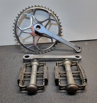 Nabízím na Eska, Favorit - převodník 46 zubů na historické kolo + pedály. Stav dle foto - převodník má zachovalý chrom, pedály jsou ve slušném stavu