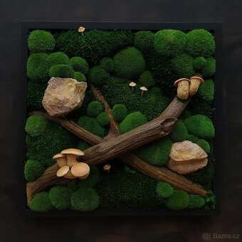 Rozměry obrazu jsou 60x60cm, rám je vysoký 7cm (obraz celkově cca 15cm). Obrazy jsou ručně vyrobené ze stabilizovaného mechu, rostlin a sušených hub tzn, že jsou bezúdržbové. Do obrazů je používán pravý, přírodní mech, který je stabilizován za pomoci konzervační látky. Rámy jsou smrkové, mořené, nabarvené nebo lakované. Obraz nesmí přijít do kontaktu s vodou nebo být skladován ve vlhkém prostředí. Vystavení přímému slunečnímu svitu snižuje životnost obrazu.