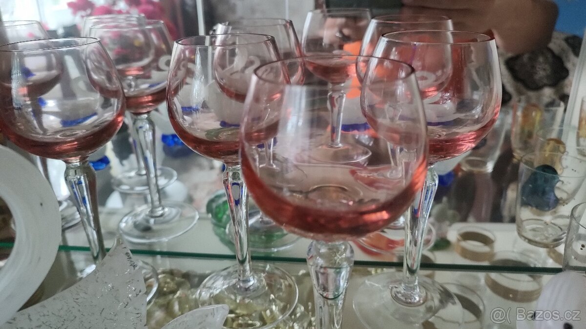 Skleničky na víno, červené sklo, na stopce, celkem 6 ks. Karviná, viz foto.