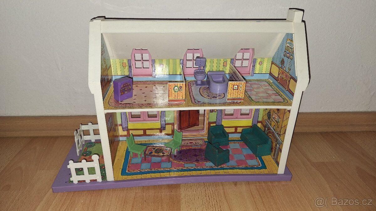 Prodám retro domeček pro panenky. Stáří určitě 30 let. Chybí nějaký nábytek a kousek plůtku, ale jinak je v pěkném stavu. Výška 26cm, šířka (domečku) 32cm.