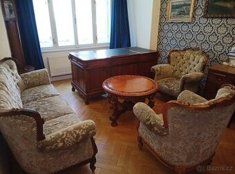 Dobrý den, prodám krásný starožitný nábytek. Jedná se o stůl, 2 křesla a velká sedačka viz. foto. Pracovní stůl není součástí prodeje. Zdarma přidám taburet, který má odlišný dekor. Rok výroby nábytku ani původ neznám, máme jej cca 8 let a byl kupován použitý. Křesla nesou stopy používání, ale nejsou poničená. Stůl je z horní strany podřený, zasloužil by přebrousit a nalakovat - mě to takto nevadí - u starého nábytku mám rád patinu. Po narození třetího potomka musíme bohužel salonek změnit na další dětský pokoj, proto prodávám. Po dohodě možné prodat i další kusy nábytku. Ideálně prodej všeho najednou. Při prodeji po kusech by byla cena vyšší. K vidění u Náměstí Míru, Praha 2. Při rychlém a solidním jednání cena pouze 16.900,-Kč - velmi spěchá. Historický nábytek, barokní nábytek, empírový nábytek. secesní nábytek, lenoška, křeslo, vyřezávaný dřevěný stůl, atd...