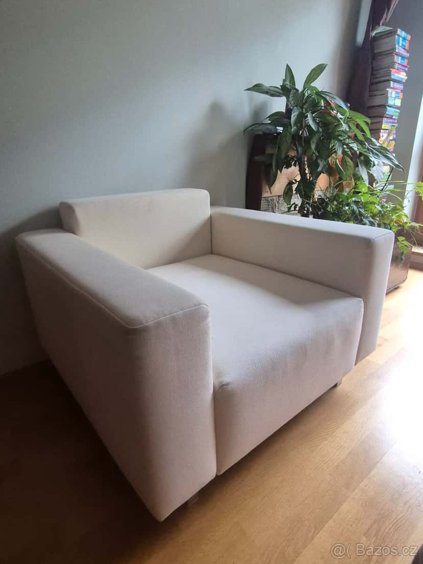 2 křesla (1 bez polštáře) světlé barvy, používané, v drobnými fleky, ale ve velmi dobrém stavu. Velikosti: hloubka 900 mm šířka 960 mm výška vpředu 580 mm, vzadu 680 mm. Pouze osobní odběr Praha 4. Nelze posílat!