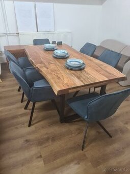 Nové , jídelní stůl z tropického dřeva akácie , suaru o vel.180x90, v.77cm tl.desky 6cm + 6x kvalitní křesla / 4x s područkami , 2x bez područek / Cena v obchodě za komplet 36 tis.Kč Prodám komplet za 17 990 Kč Pouze stůl 8990 Kč