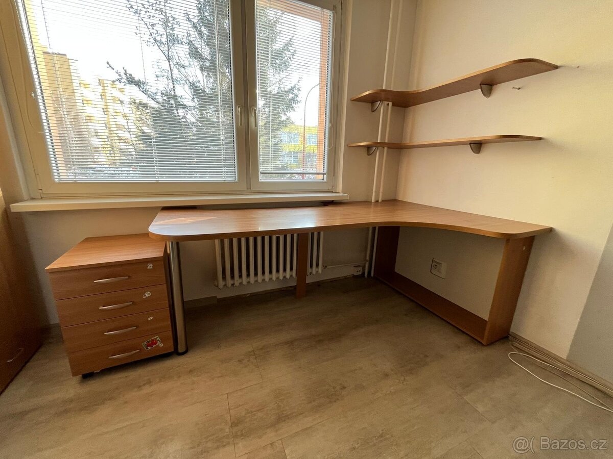 Prodám rohový psací stůl, včetně pojízdného šuplíkového kontejnerů, poliček pod stolem a nad stolem. Do poliček pod stolem patří ještě dvě police, které na fotce nejsou. Sloužily jako knihovna .
