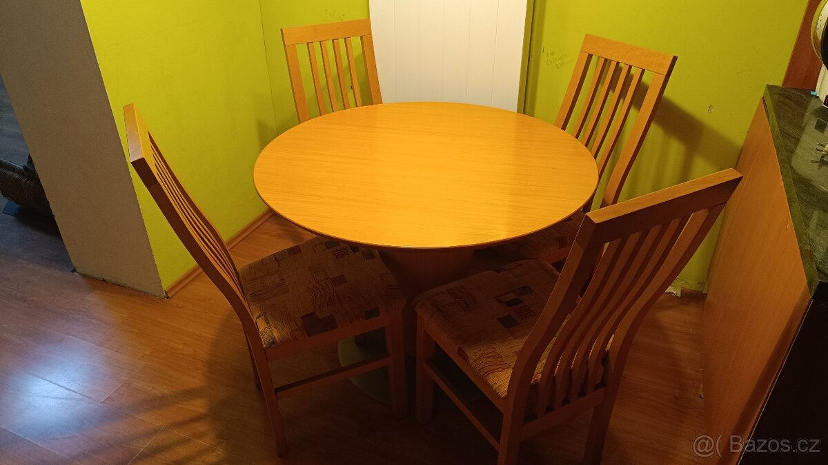 Prodám používaný kulatý stůl o průměru 100 cm a k tomu 4 židle.