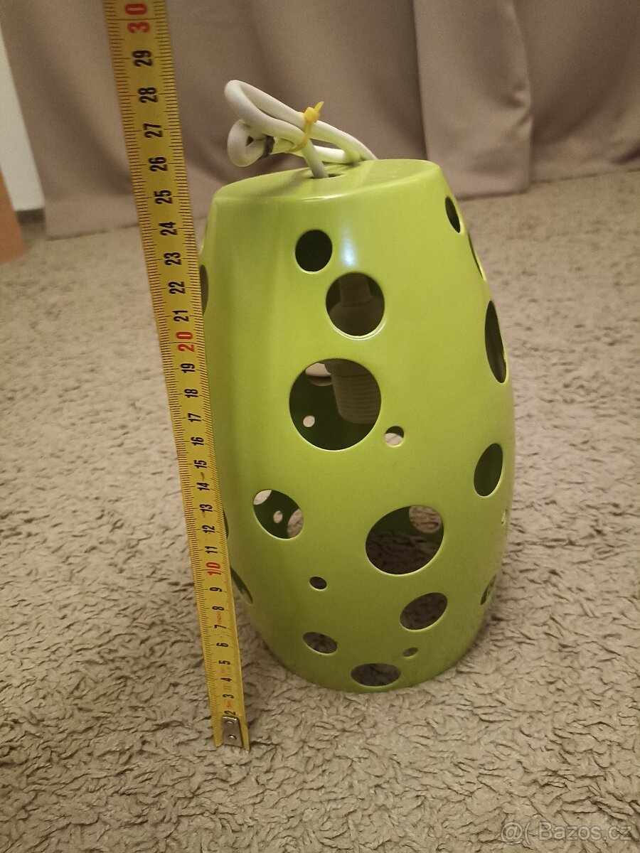 Kovová zelinkavá lampa s dírama, skrz které krásně proniká světlo.Cca 25x14cm.