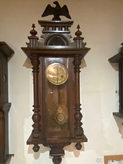 Nabízím krásné mechanické nástěnné hodiny německé výroby z období konce 19. století. Dle značení strojku s okřídleným kolem se jedná o produkci některého z německých výrobců sdružených kolem Junghans/GB v období cca 1880–1905. Hodiny mají původní mechanický strojek na klíček (dvouzávažový systém – chod a bití). Jedná se o poctivou historickou práci z doby, kdy byly hodiny nejen praktickým předmětem, ale i dominantou interiéru.