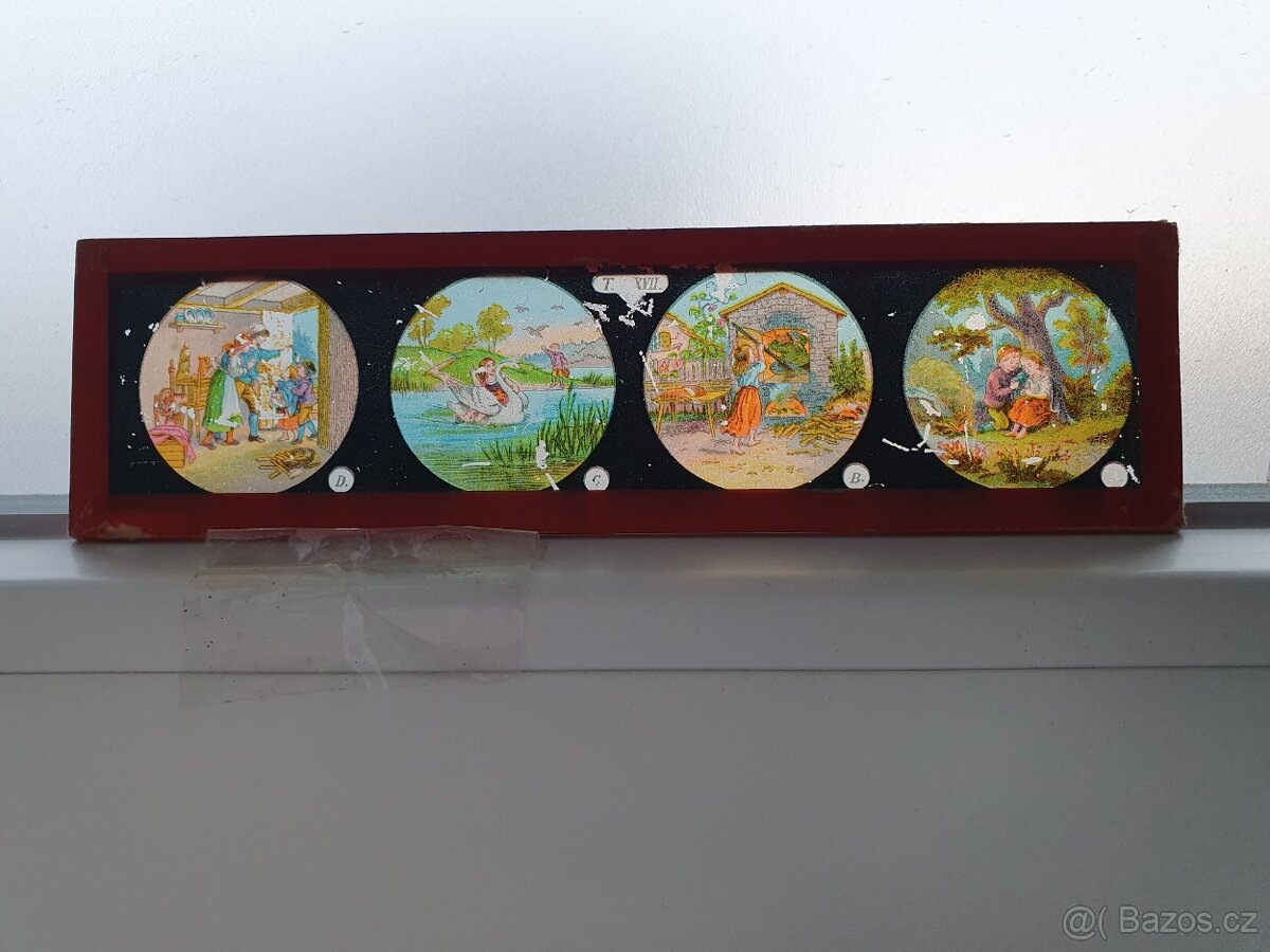 Skleněné obrázky do promítačky Laterna Magica. Na jednotlivých sklech jsou vyobrazeny pohádky. A jiné příběhy. Cena je uvedena za jeden kus.