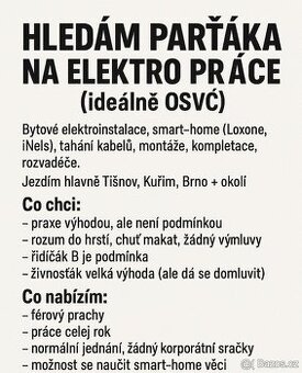 HLEDÁME PARŤÁKA NA ELEKTRO PRÁCE (ideálně OSVČ) Hledám spolehlivýho člověka na domovní elektroinstalace, smart-home (Loxone, iNels), Zabezpečovací a kamerové systémy, tahání kabelů, montáže, kompletace, rozvaděče. Jezdíme hlavně Tišnov, Kuřim, Brno + okolí. Co chci: – praxe výhoda, ale nemusí být – rozum do hrsti, chuť makat, žádný výmluvy – řidičák B je podmínkou – živnosťák velká výhoda (ale dá se domluvit) Co nabízím: – férový prachy – práce celej rok – normální jednání, žádný korporátní sračky – možnost se naučit smart-home věci Kontakt: +420 608 469 292 nebo info@elektroheger.cz