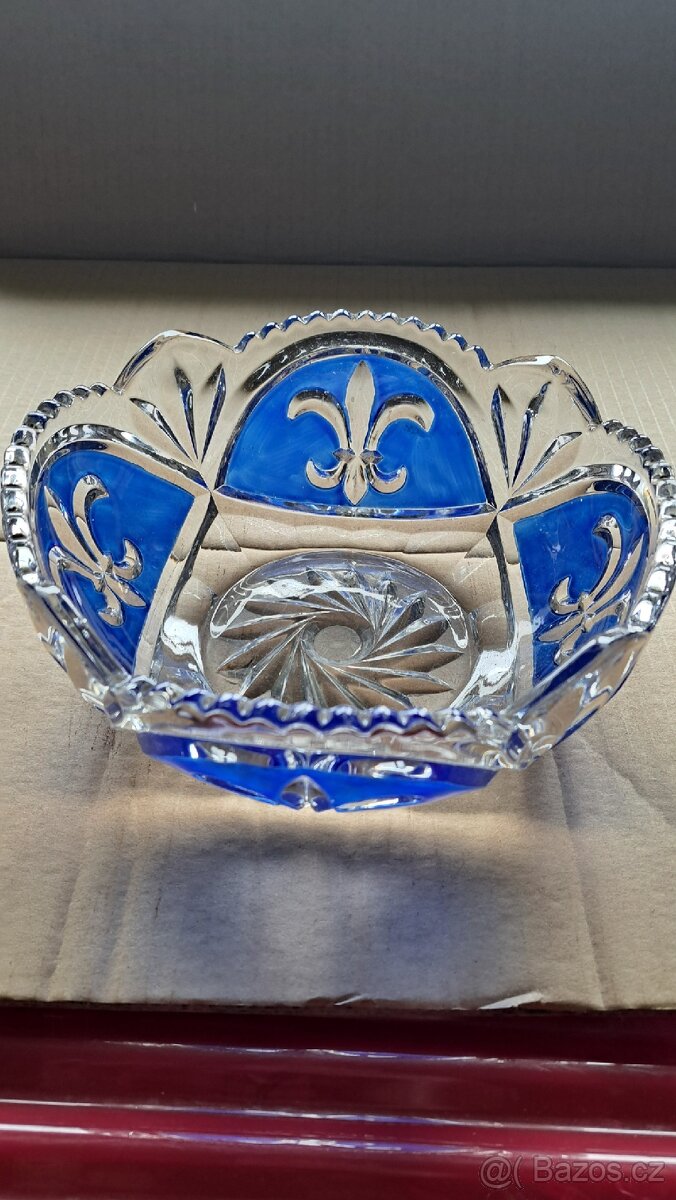 Stará skleněná mísa se vzorem a modrou barvou.Nerozbité neprasklé.použité.rozměry viz fota.Kuryrem nezasílám