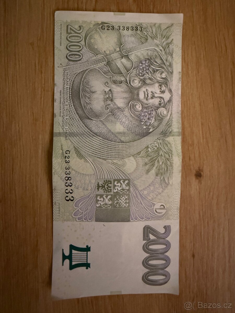 Prodám bankovku 2000 Kč, série G23, sériové číslo 338333. Zajímavé opakující se číslo, vhodné pro sběratele. Stav viz foto. Osobní předání / zaslání po dohodě.