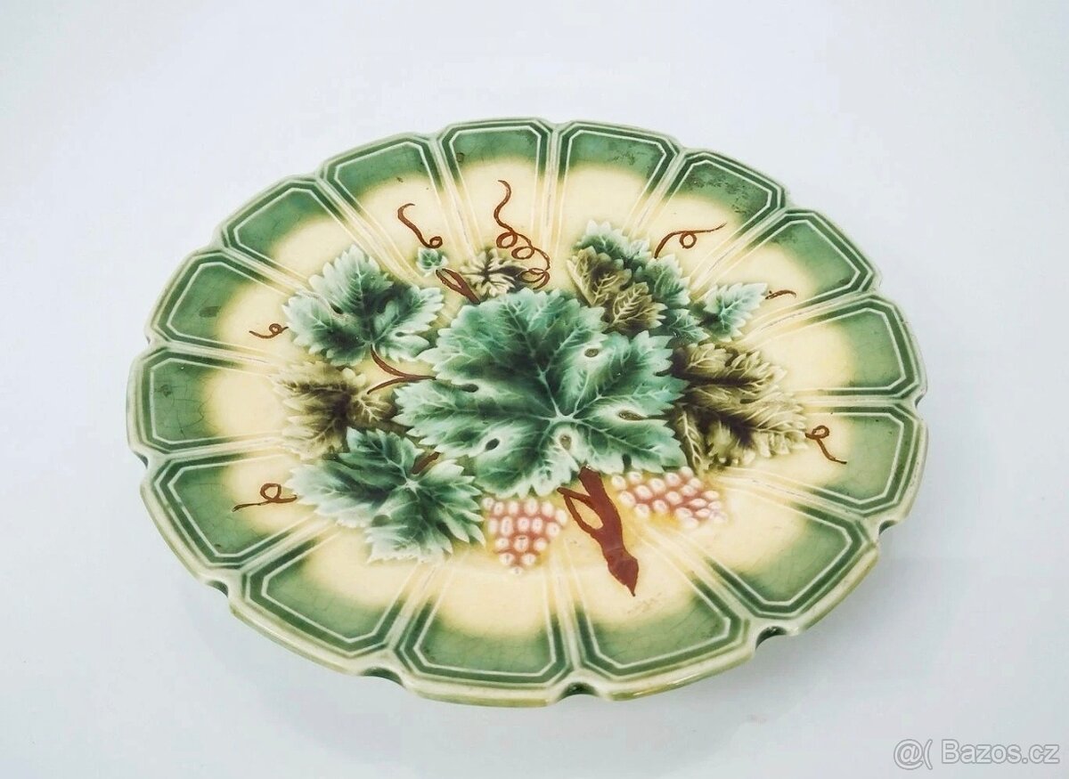 Nabízím krásný starožitný talířek v secesním stylu z kameniny, výroba Francie - Sarreguemines. Krásný starý kousek, průměr cca 19,5 cm. Bez vad, moc pěkný stav viz. foto. Koukněte i na ostatní mé věci, nabízím spoustu krásných starých věcí z pozůstalosti.