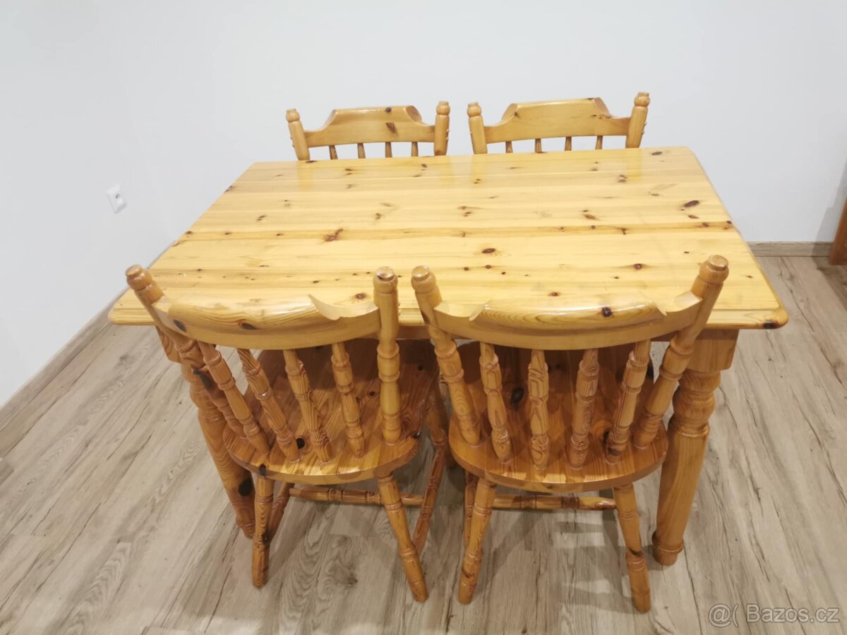 Prodám stůl, 4 židle, dřevo borovice, všechno funkční není nic zlomeného, občas oděrky, stůl se da rozdělat. Přírodní lak . Stůl šíře 80/delka 120/ vejska 75. Židle 44/hloubka 42/výška 86