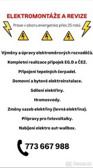 Cena: Dohodou. Nabízím: ● Realizaci elektro přípojek. ● Výměny a úpravy rozvaděčů. ● Domovní i bytová instalace. ● Změny distribuční sazby-levná elektřina. ● Kompletní realizace hromosvodů- LPS. ● Sdílení energie-komunitní energetika. ● Půjčovna stavebních rozvaděčů.