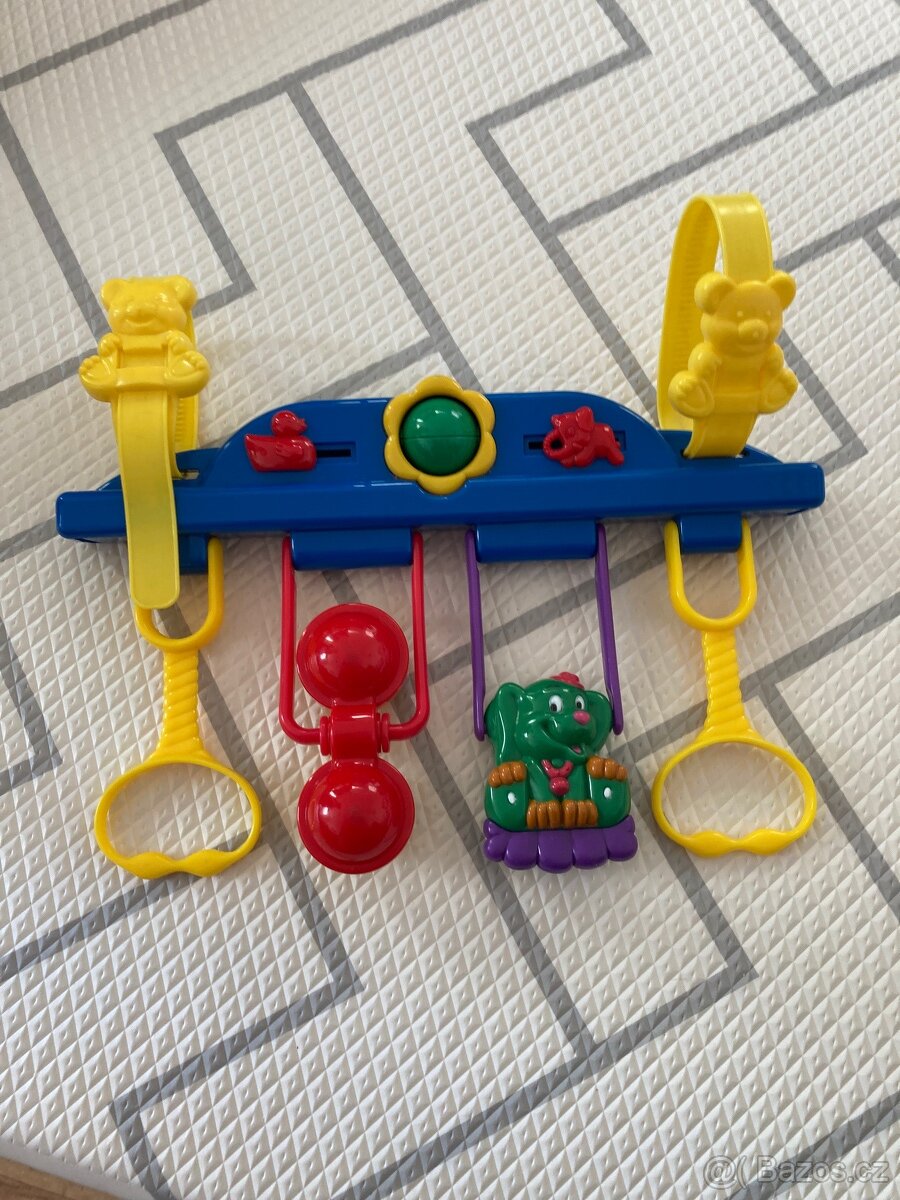 Krásná hrazdička na zavěšení . Štěrchá, kulička jde točit, kačenka a slon posuvný- vydává zvuk. Dvě madýlka na zachycení. V krásném stavu, hraná a oblíbená hračka.