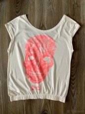 Dámské / dívčí bílé tričko / top s růžovou lebkou, značka Bershka. Výstřih na zádech nad zapínáním podprsenky. Velikost S, rozměry délka trika 63 cm ( po zadek), poloměr přes prsa 46 cm. Volné triko balonovitého tvaru. Dole na gumu. Použité minimálně. Možno zaslat.