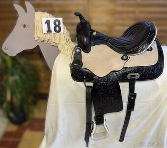 Westernové sedlo-komplet č.18) v černé barvě kombinované se světlou přírodní, s bílým lemem zadní rozsochy. Velikost sedla je Full/QH, 16" (40,5cm) i 17" (43cm) v sedu, a gulett/komorou 9,5" (24cm). Celková délka sedla je 65cm. Sedlo je v částečné dekoraci Floral. Sedlové bočnice hladké, bez zdobení. Černý měkký kožený sed s prošíváním Kvalitní a silná kůže na Fiber-glass kostře (lehké, pružné a pevné). Jednoduchý systém posouvání délky fendrových řemenů přes klasickou přezku. Sedlo je zkompletováno se: Zadními sedlovými řemeny k zadnímu podbřišníku, na levém řemenu s pouzdrem. Uzdečkou, poprsníkem a otěžemi vše v barvě i dekoraci sedla. Sedlovým pouzdrem. Předním provázkovým podbřišníkem a zadním koženým podbřišníkem s propojovacím řemínkem. Cena kompletu 13.999,-Kč. Odesílám společností PPL platbou na dobírku/299,-Kč nebo platbou převodem, popř.PayPal/215,-Kč společností PPL.