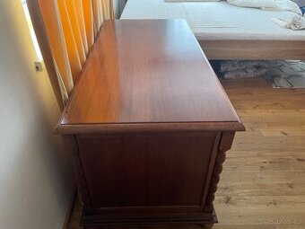 Stůl je dřevěný se dvěmi šuplíky a zabudovanými skříňkami