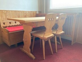 Bytelný selský nábytek z Krásné jizby. Stůl, lavice s úložným prostorem, 4 židle, velký příborník - komoda. Používaný, funkčně v pořádku.