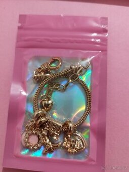 Nový, nenošený náramek s různými přívěsky jako je zámek, srdce, kovbojská bota. Délka náramku je 16 cm.