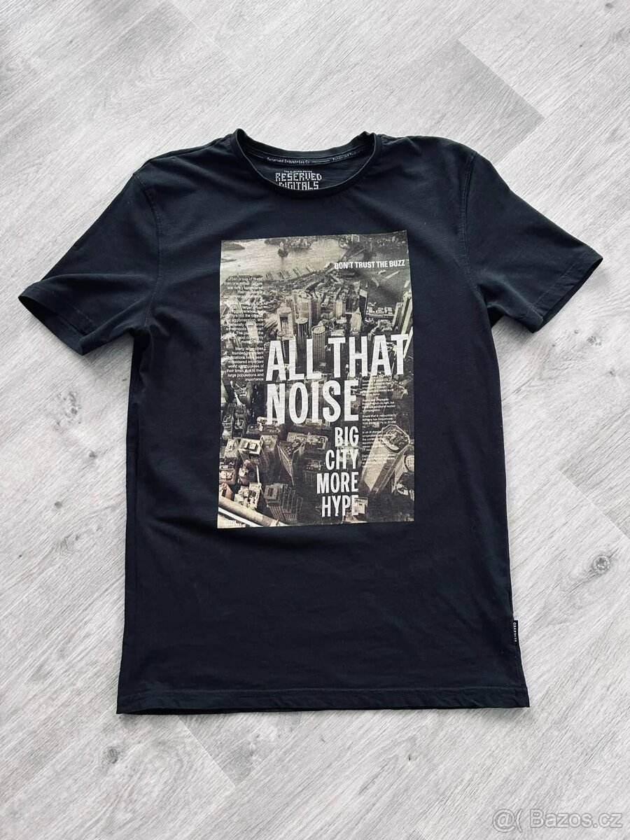 Prodám černé pánské tričko značky Reserved s potiskem All That Noise. Velikost L, ostatní rozměry viz. fotografie, regular fit. Příjemný materiál, nošené minimálně, pěkný stav bez děr a skvrn. Cena 90 Kč plus zásilkovna či balíkovna.
