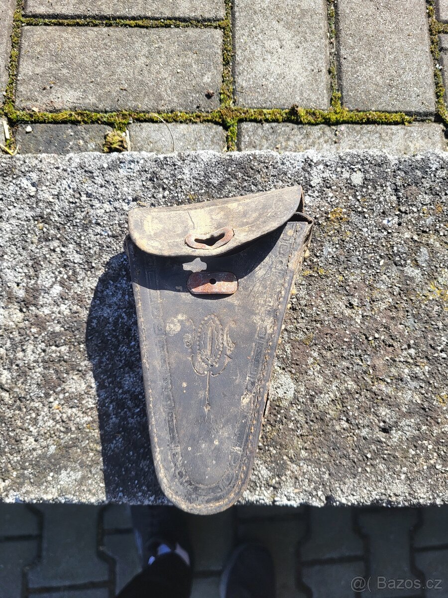 Staré kožené (vojenské nebo hasičské) pouzdro (bohůžel jsem nedokázal identifikovat přesně o jaké pouzdro se jedná). Chybí kolíček na zapínání. Švy drží z jedné strany z druhé strany jsou prasklé (viz. foto).